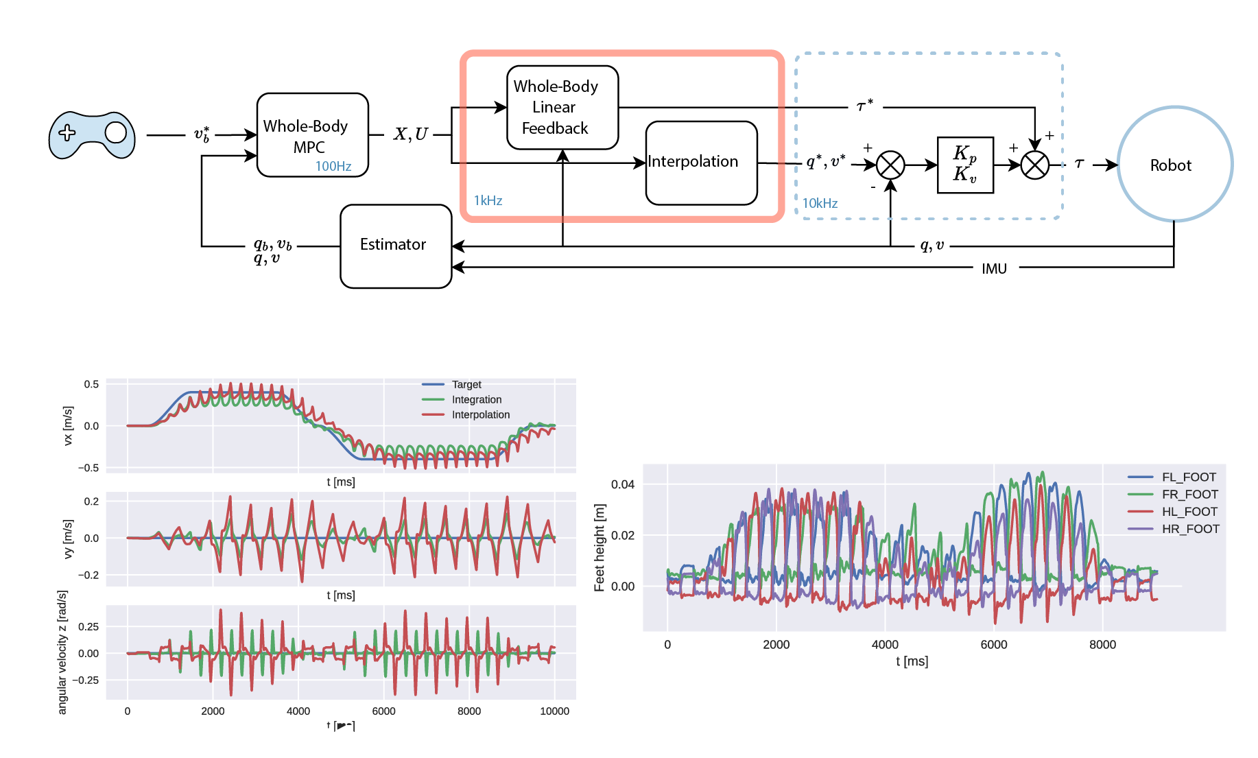 To stabilize the system, a high-frequency Low Level Controller (LLC) was implemented as a PD+ controller, using position and velocity references from the MPC and incorporating Riccati gains for feedback. A significant innovation was eliminating predefined foot trajectories, instead dynamically adjusting foot positions based on required forward velocity through a cost term in the MPC's cost function.